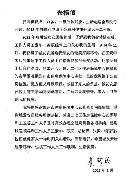 1月9日清晨,崔老師一家分別向住保中心、城發安居贈送了錦旗,并送來一封表揚信,對住保中心所展現的認真負責態度以及為民解憂的卓越作風表達了高度贊揚,同時也對城發安居工作給予了肯定鼓勵。