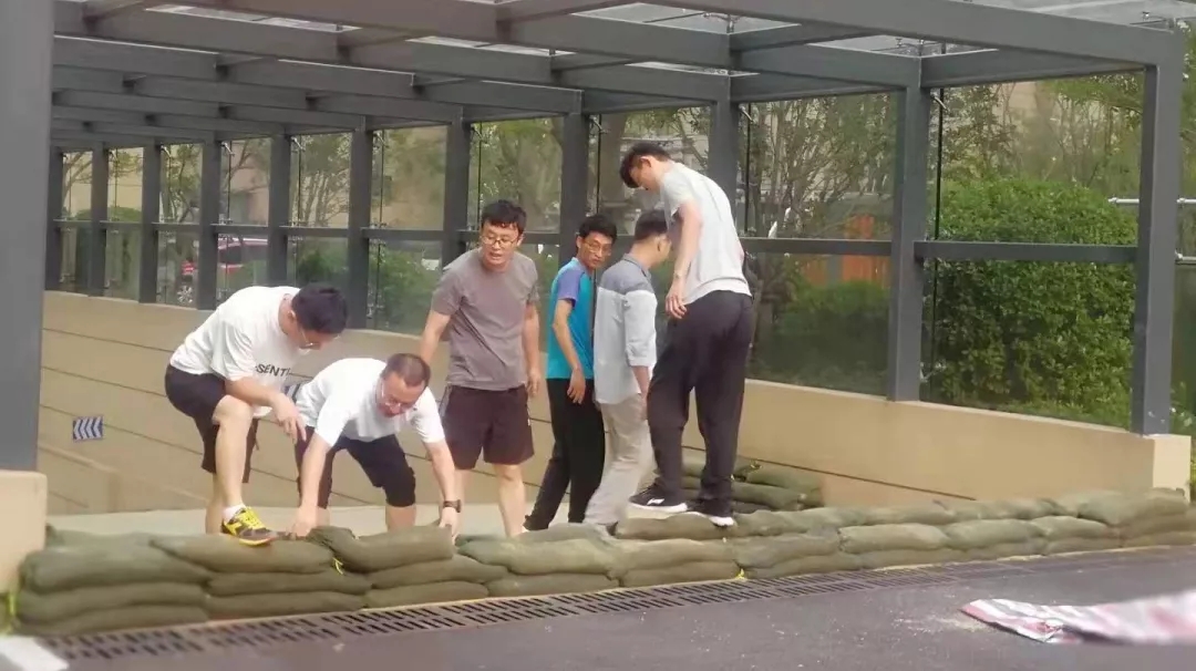 在金岱科創(chuàng)城鄭地發(fā)展公司市政道路提升改造現(xiàn)場,公司負(fù)責(zé)人帶隊檢查每條道路的沙袋、隔離護(hù)欄等防汛措施準(zhǔn)備情況。在金岱科創(chuàng)城商務(wù)服務(wù)中心,針對下沉庭院等有深基坑可能發(fā)生嚴(yán)重積水內(nèi)澇的點位,公司提前謀劃,協(xié)調(diào)發(fā)電機和水泵并安裝調(diào)試到位,確保一旦發(fā)生停電積水等極端情況,立即進(jìn)行抽排。在商務(wù)服務(wù)中心一樓大廳,公司將LED大屏等電子信息設(shè)備進(jìn)行防水覆蓋,同時對可能發(fā)生滲水的部位進(jìn)行排查加固,確保公司重要資產(chǎn)不受損失。