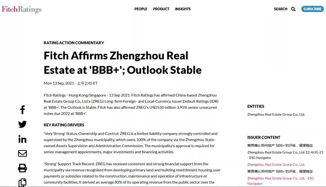 2021年9月13日,惠譽(yù)國際評級確認(rèn)鄭州地產(chǎn)集團(tuán)有限公司(簡稱:鄭州地產(chǎn))發(fā)行人評級為“BBB+”,展望穩(wěn)定。