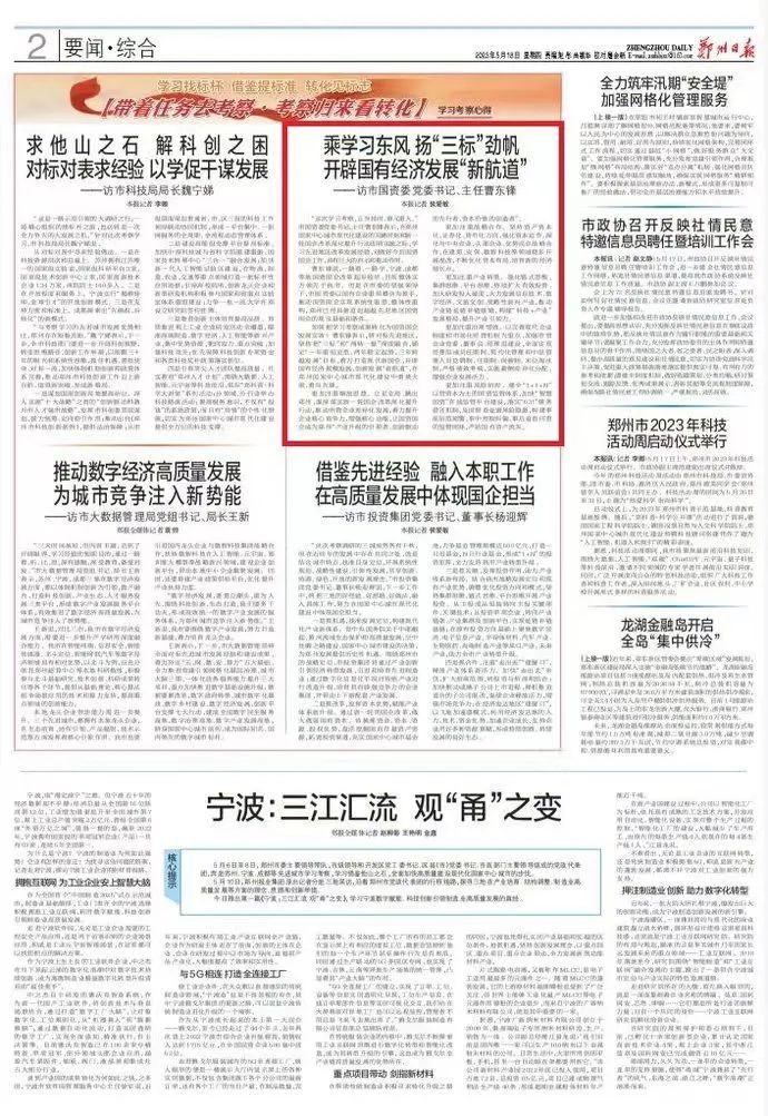 5月18日,《鄭州日報》刊發(fā)市國資委黨委書記、主任曹東鋒專訪文章《乘學(xué)習(xí)東風(fēng) 揚“三標(biāo)”勁帆 開辟國有經(jīng)濟發(fā)展“新航道”》,為您全文分享如下——